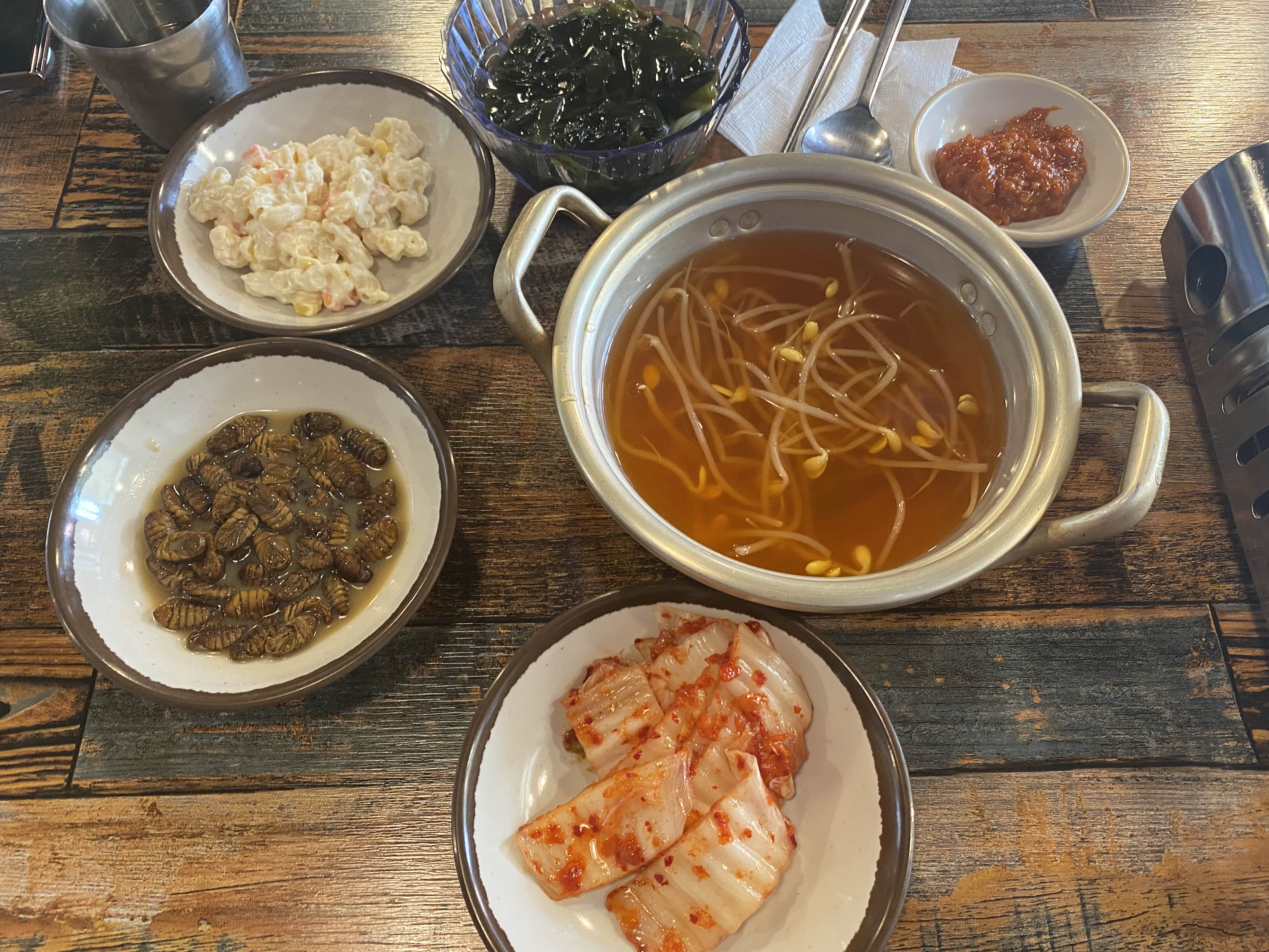 마카로니 샐러드, 번데기, 콩나물국, 미역냉국, 쌈장,